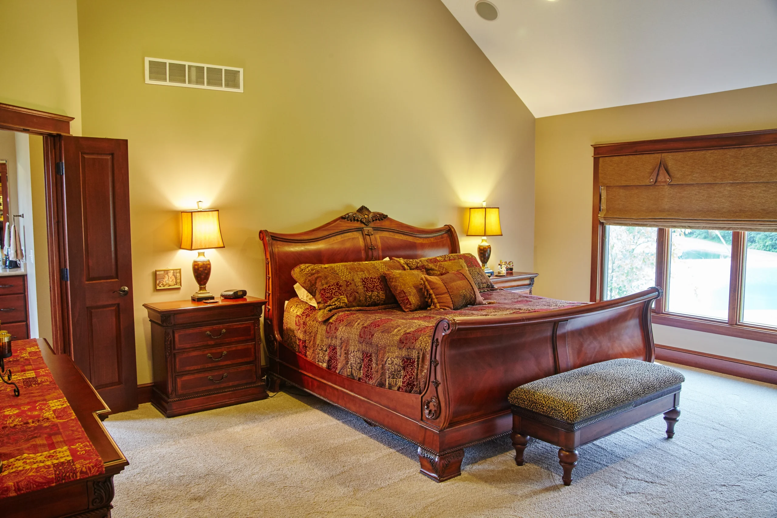 - Add a Statement Rug :Position a soft, stylish rug beneath or near your sleigh bed to define the space. Choose a textured or patterned design to complement the curves of the bed.